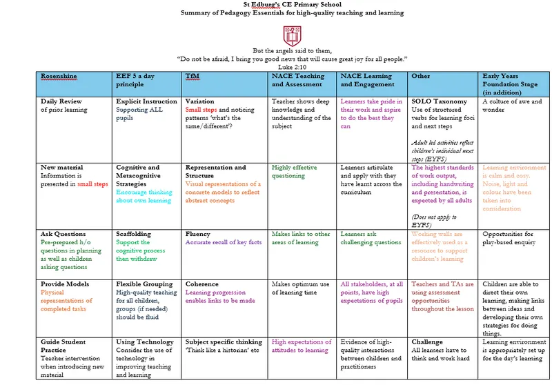At St Edburg's we offer high quality CPD which ensures we deliver the highest quality teaching and learning experience for our children. Our approach is influenced by elements of Teaching for Mastery, the NACE core principles, Rosenshine, EEF research and the SOLO Taxonomy Scale (Structure of Learning Outcomes). See below for St Edburg's Pedagogy Essentials model.